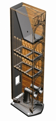 この方式は、アンダーポートは低域に新たな深みを与え、フロントポートは低域特性の全てに影響します。さらにベースを持つ事でスピーカーの設置場所による影響を受けることがなくなります。