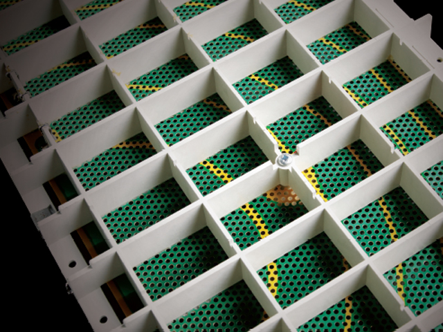 ![]() | 音源の心臓部:パワーユニットエレメント 電極が同心円状のパターンを描くパネル。 ESL2805は4枚、ESL2905は6枚を使用しています。 |