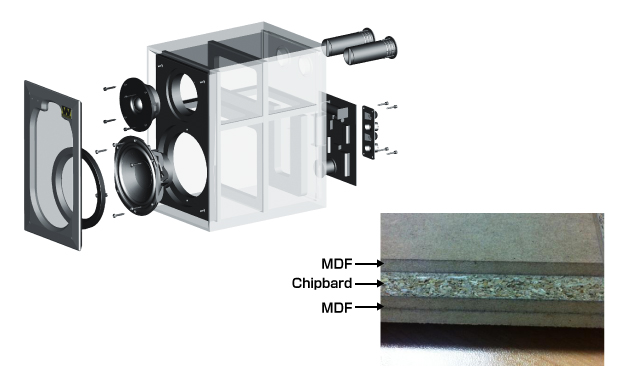キャビネットの共振で発生する内部干渉を低減させ、より正確な音の質感を得るために異なる素材のチップボードとMDFをワーフェデール独自の3層サンドイッチ構造採用。