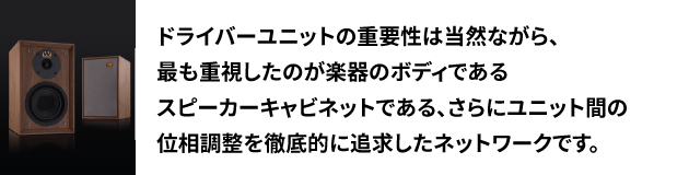 適切な位相を整合させるために高度なテクニック理論のひとつでもあるLinkwitz-Rileyフィルターに基づいています。クロスオーバーの研究は、各ユニットの特性を考えリニアフェイズ(直線位相)を得るために各ユニット間のレベルと周波数を最新コンピューターで正確に解析しました。これは非常に高度なテクニックを要する作業です。このように設計に当たってはワーフェデールの高度なクロスシミュレーションソフトでモデリングし、さらに耳による音の微調整を聴感上からも行い、その結果、一層伝統的なワーフェデールの特質を生かしたサウンドを得ることができました。