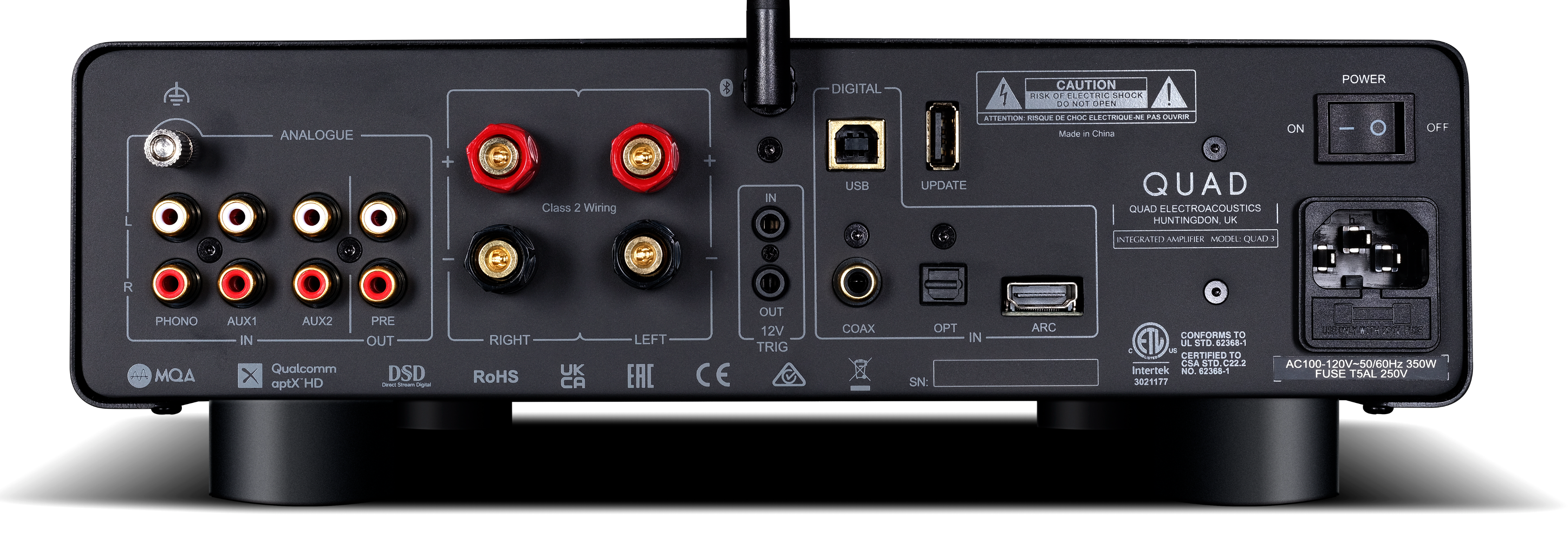 これにはESSテクノロジーのHyperStream IIアーキテクチャとTime Domain Jitter Eliminatorを最大限に活用する回路が搭載され超低ノイズと高ダイナミックレンジを実現しています。独自のクロック回路と電源回路がDACの性能を高めクラスAポストDACアクティブ・フィルターがQUAD 3のデジタル・ソースの優れた音質を可能にします。ハイレゾ対応は最先端であり、PCMは32ビット/768kHzまで、DSDはUSB経由で22.5792MHz(DSD512)まで対応します。フルMQAデコード機能を搭載し、さらにQUAD3はRoonオーディオ環境で使用できる「Roon Tested」認定を受けています。